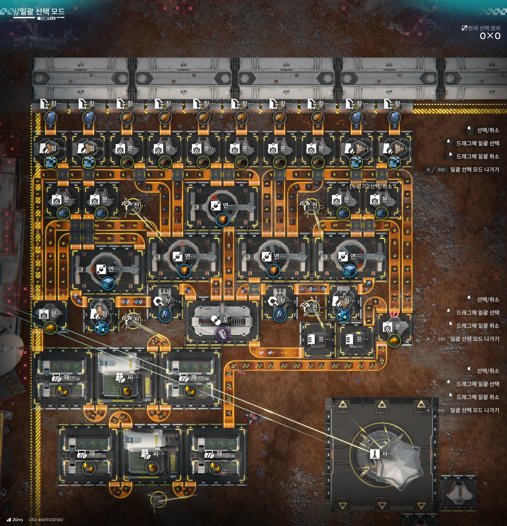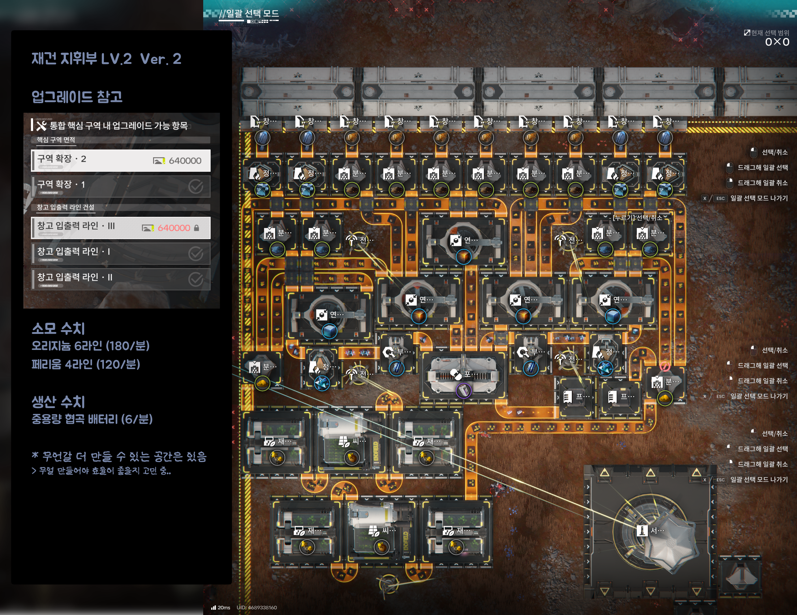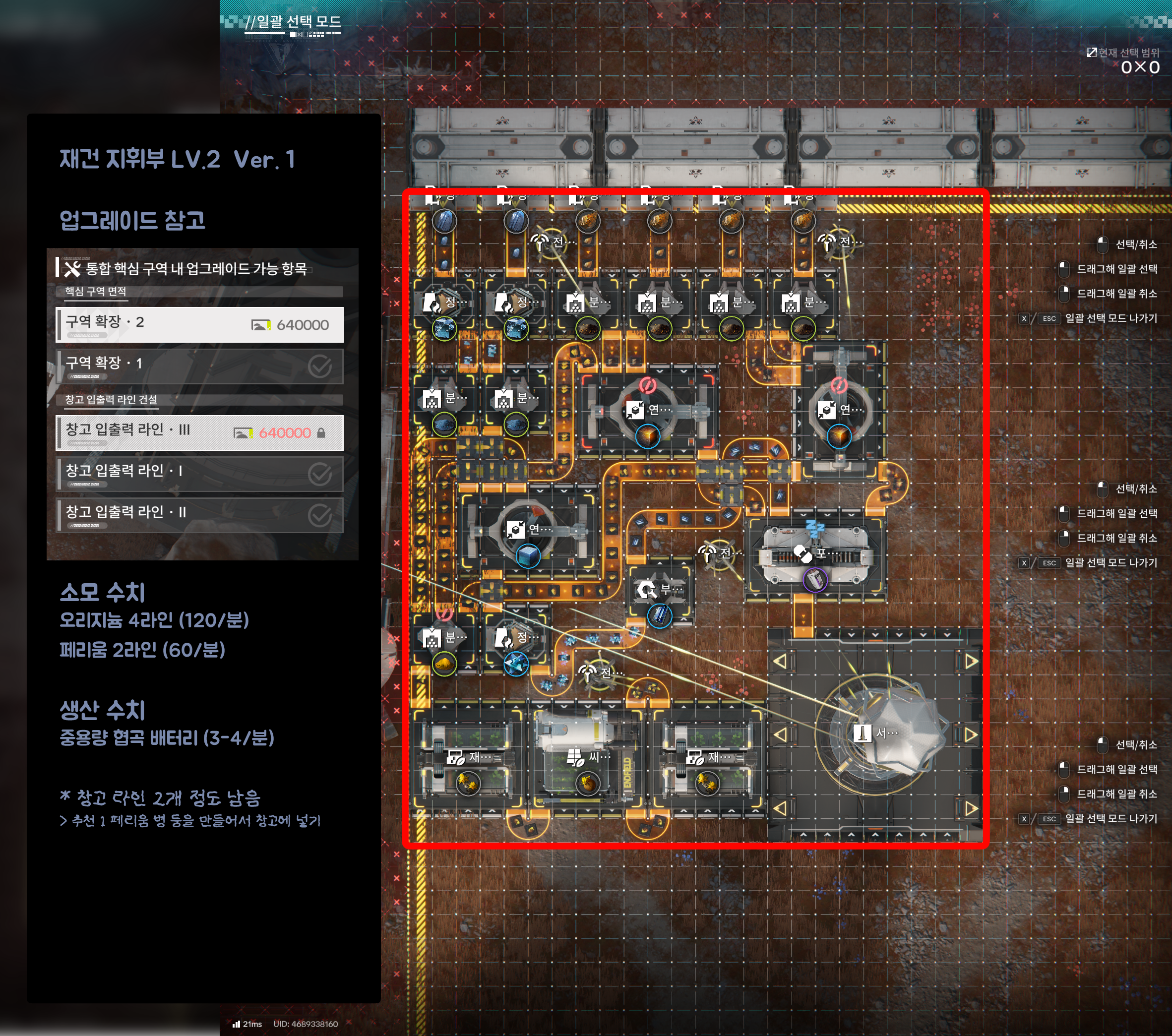 총 칸 소모 자원 수치 생성 자원 수치 0*0 (0칸) 오리지늄 광석 0/분 (라인) 페리움 광석 0/분 (라인)